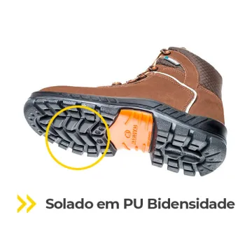 O solado em PU bidensidade é leve, resistente e antiderrapante. Oferece conforto, boa absorção de impacto e aderência em diferentes superfícies.