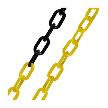 Corrente plástica amarelo/preto elo 30mm - (05 metros). Excelente para uso externo, não perdendo cor ou descascando com a ação de intempéries. Demarcar área - Pdt: 3,0m/C50: 1,5m. Corrente de sinalização e isolamento, em plástico de alta durabilidade, resistência mecânica e contra altas temperaturas.