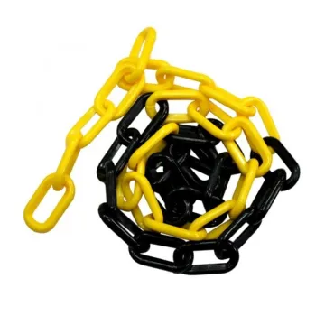 Corrente plástica amarelo/preto elo 60mm excelente para uso externo, não perdendo cor ou descascando com a ação de intempéries. Demarcar área - Pdt: 3,0m/C50: 1,5m/C75: 3,0m. Corrente de sinalização e isolamento, em plástico de alta durabilidade, resistência mecânica e contra altas temperaturas.