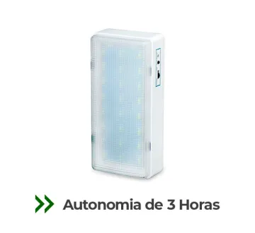 Funciona por até 3 horas com carga completa, ideal para rotas de fuga, escadas e corredores.