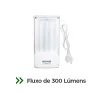 Possui fluxo luminoso de 300 lúmens, cobrindo áreas de até 50 m² com autonomia de 1,5 horas, atendendo com eficiência às exigências de aclaramento em ambientes internos. A alimentação é bivolt automática (110/220V) e a bateria de níquel-cádmio (Ni-Cd) garante até 500 ciclos de carga.