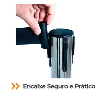 O pedestal possui encaixe seguro e prático, com fita retrátil que se conecta facilmente a outros pedestais.